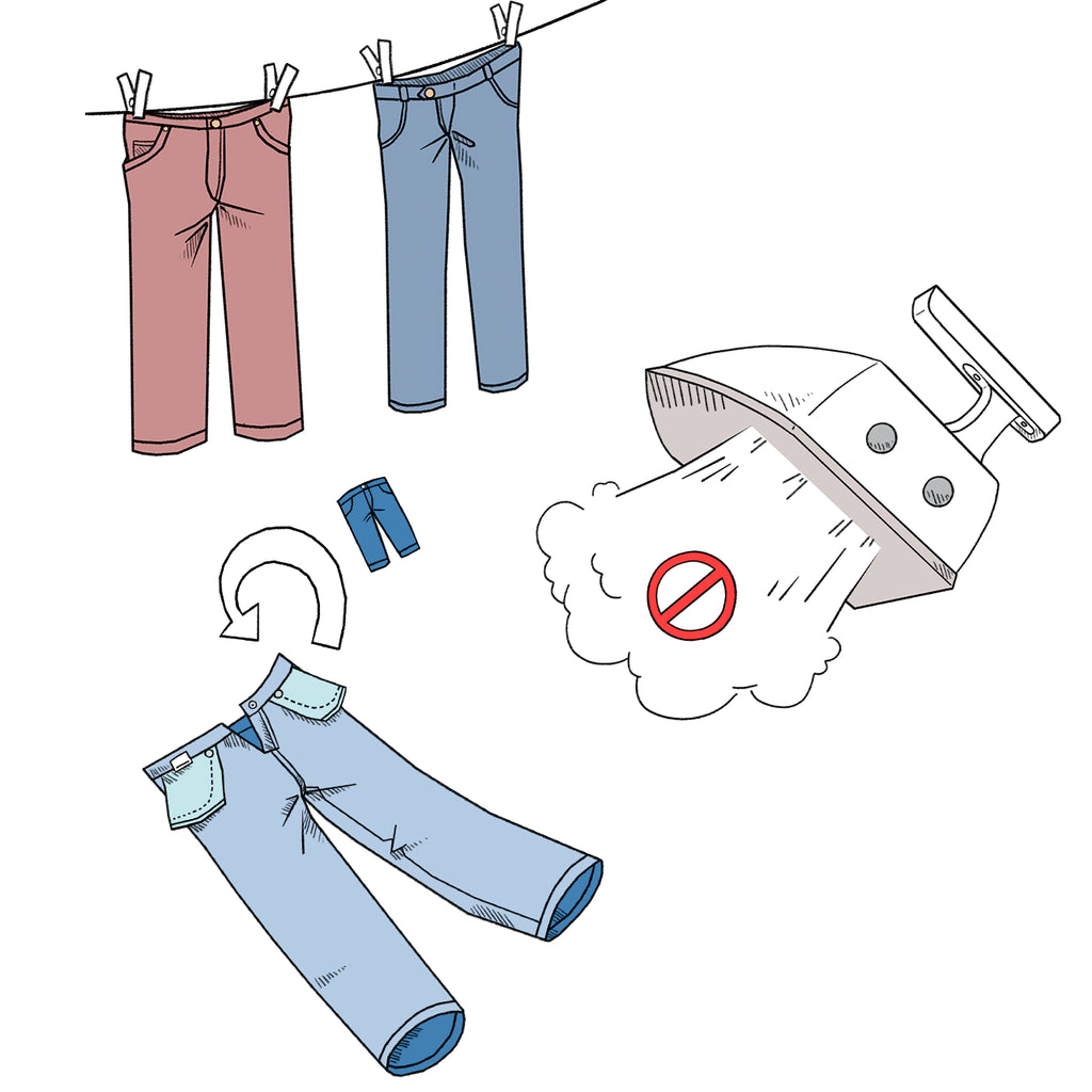 Wir empfehlen, die Hosen mit der Hand glatt zu streichen und tropfnass zum Trocknen aufzuhängen.