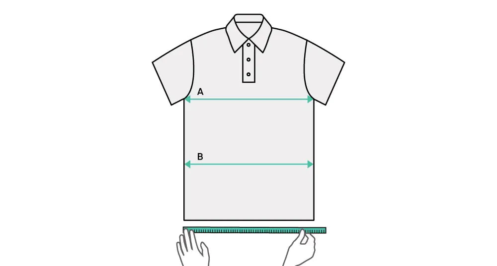 Nehmen Sie ein gut sitzendes Shirt und legen Sie dies flach auf einen Tisch. Bei einem Hemd oder Poloshirt ist es wichtig, die Knöpfe zu schließen. Um die Oberweite zu ermitteln, messen Sie unterhalb des Armausschnitts von links nach rechts (A). Anschließend messen Sie bitte die Taillenweite (B) aus.